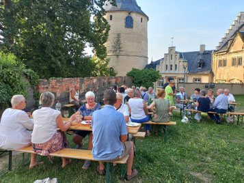 Über 30 Mitglieder des Schlossvereins wurden zunächst von Frau Dr. Gudrun Schreiber durch die Ausstellung "Erziehung und Emazipation - Die verborgene Welt des Altenburger Magdalenenstifts" geführt. Anschließend klang ein gemütlicher Abend am Hausmannsturm beim traditionellem Grillfest aus.
